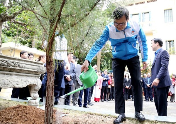 Đồng chí Bùi Quang Huy trồng cây trong khuôn viên cơ quan Trung ương Đoàn, hưởng ứng Tết trồng cây Xuân Ất Tỵ 2025. Ảnh: Lâm Đăng Hải