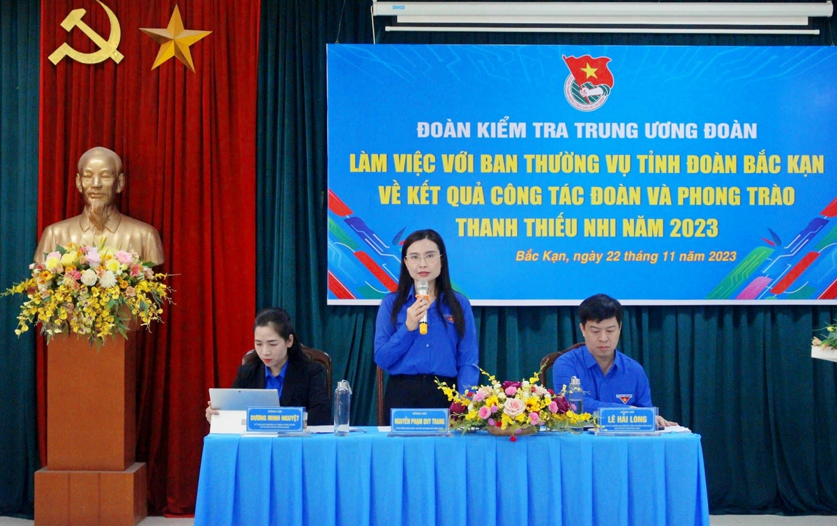 Tại buổi làm việc, Ban Thường vụ Tỉnh đoàn Bắc Kạn đã báo cáo tóm tắt kết quả công tác Đoàn và phong trào thanh thiếu nhi; việc thực hiện chủ đề công tác năm chuyển đổi số các hoạt động của Đoàn; kết quả thực hiện các chủ trương mới của Nghị quyết Đại hội Đoàn toàn quốc lần thứ XII.