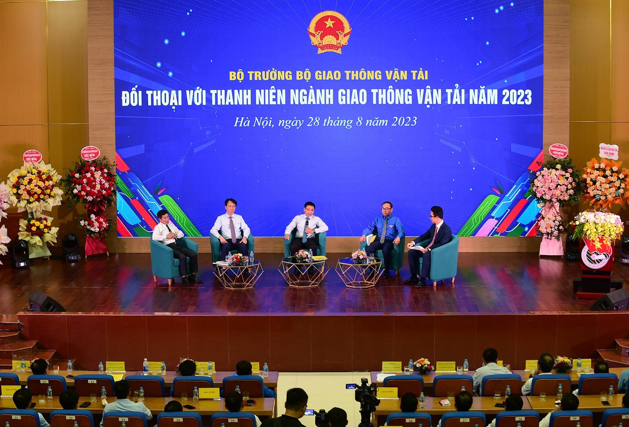 Đồng chí Nguyễn Văn Thắng- Bộ trưởng Bộ GTVT cùng các đồng chí: Vũ Thành Trung - Ủy viên Ban Cán sự đảng, Vụ trưởng Vụ Tổ chức cán bộ, Bộ GTVT; Nguyễn Giao Linh – Bí thư Đoàn Thanh niên Bộ GTVT; PGS. TS Nguyễn Hoàng Long – Hiệu trưởng Trường Đại học Công nghệ GTVT đối thoại với đoàn viên thanh niên ngành GTVT