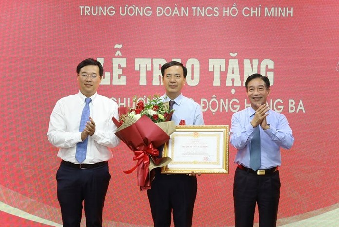 Thừa ủy quyền của Chủ tịch nước, đồng chí Phạm Thanh Hà - Phó Chủ nhiệm Văn phòng Chủ tịch nước và đồng chí Lê Quốc Phong, Ủy viên dự khuyết BCH Trung ương Đảng, Bí thư thứ nhất Trung ương Đoàn đã tặng Huân chương Lao động hạng Ba cho nguyên Phó Bí thư thường trực Đảng ủy, Chủ nhiệm Ủy ban Kiểm tra Đảng ủy Trung ương Đoàn Nguyễn Anh Tuấn vì đã có thành tích xuất sắc trong công tác, góp phần xây dựng và bảo vệ Tổ quốc, giai đoạn 2014 - 2018. Ảnh: Bảo Anh