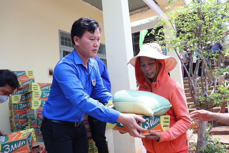Đồng chí Trần Hoàng Trực - Bí thư Tỉnh Đoàn, Chủ tịch Hội LHTN Việt Nam tỉnh trao tặng quà cho cựu thanh niên xung phong và người dân có hoàn cảnh khó khăn tại huyện biên giới Bù Đốp