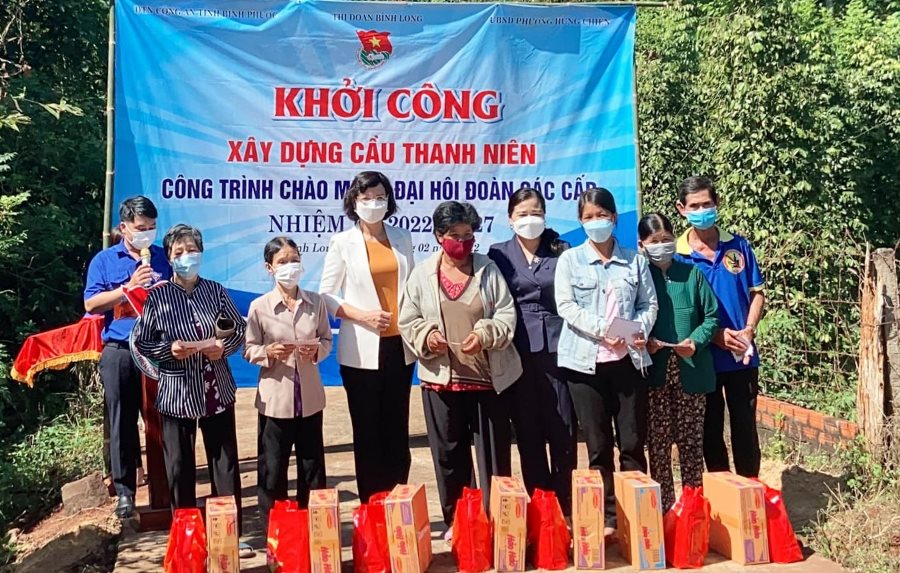Tặng quà cho các hộ gia đình khó khăn tại Lễ khởi công xây dựng cầu thanh niên ở thị xã Bình Long