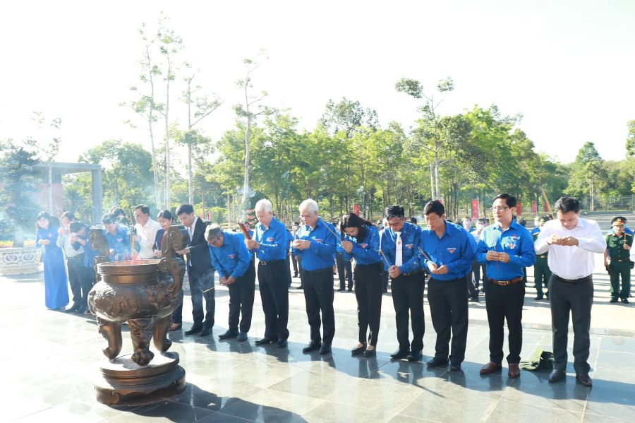 Các đại biểu đã thành kính dâng hương tưởng nhớ các anh hùng liệt sĩ tại Đài tưởng niệm của Khu di tích quốc gia đặc biệt Bộ Chỉ huy miền Tà Thiết