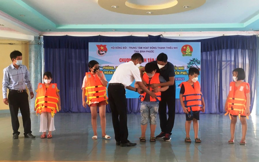 Các huấn luyện viên hướng dẫn học sinh cách sử dụng phao; tuyên truyền phòng, chống đuối nước cho trẻ em.