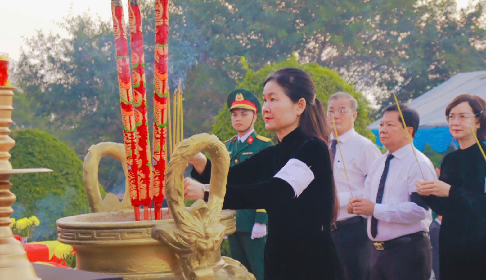 Trong không khí trang nghiêm, các đoàn đại biểu đã kính cẩn dâng hoa và dâng hương tưởng nhớ, tỏ lòng thành kính và biết ơn các anh hùng liệt sĩ đã hy sinh vì độc lập, tự do của dân tộc, vì nghĩa vụ quốc tế cao cả.