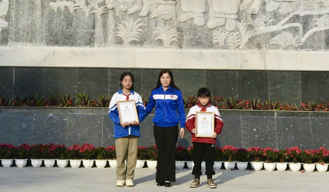 Đồng chí Nông Thị Nhung, Phó Bí thư Tỉnh đoàn, Chủ tịch Hội đồng Đội tỉnh trao giải Cuộc thi vẽ tranh với chủ đề “Em yêu chú bộ đội” cho các em học sinh