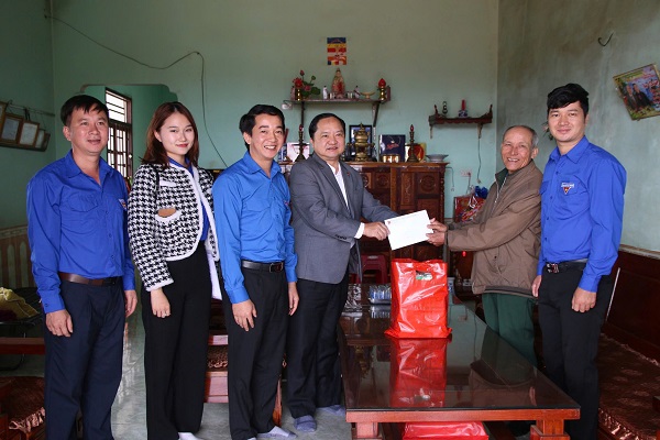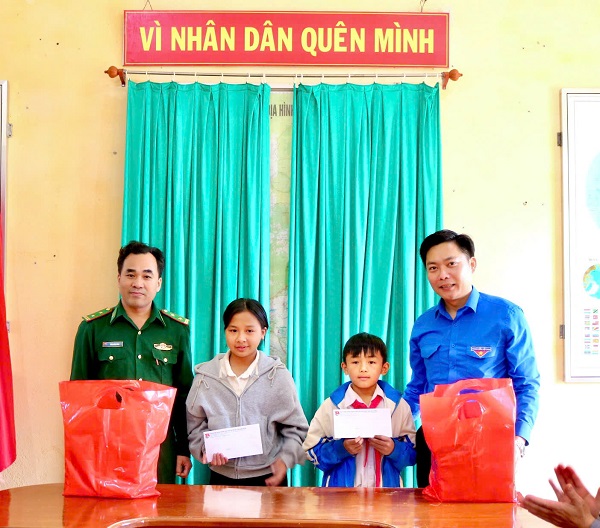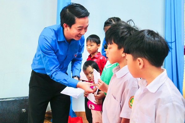 Đồng chí Trương Văn Bình, Ủy viên BCH TW Đoàn, Bí Thư Tỉnh đoàn trao tặng quà cho các em học sinh có hoàn cảnh khó khăn