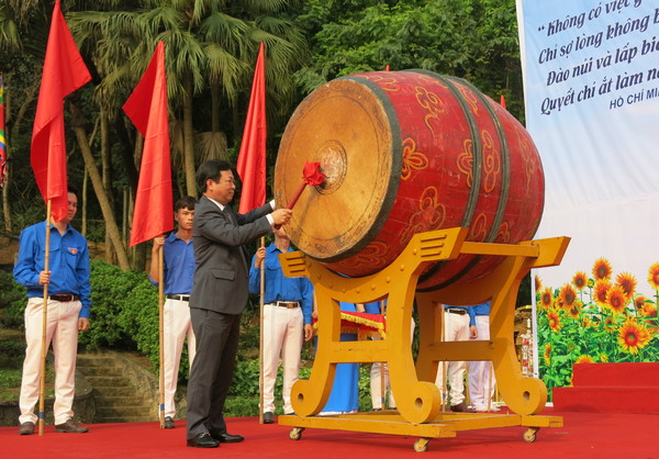 Ngay sau lễ phát động, các đại biểu và ĐVTN tham gia trồng hoa và gắn biển khánh thành công trình thanh niên cấp tỉnh “Vườn hoa thanh niên – Nhớ lời Di chúc theo chân Bác” tại bức phù điêu Bác Hồ nói chuyện với cán bộ, chiến sĩ đại đoàn quân tiên phong trong khu Di tích lịch sử Đền Hùng.