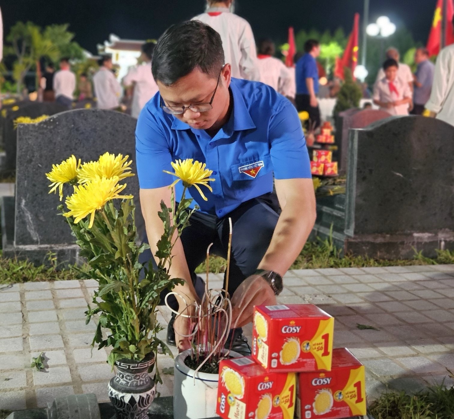 Đồng chí Hồ Hồng Nguyên - Uỷ viên Ban Thường vụ, Trưởng Ban Thanh niên Trường học T.Ư Đoàn, Phó Chủ tịch Thường trực T.Ư Hội Sinh viên Việt Nam cùng ĐVTN dâng hương trên các phần mộ Liệt sĩ