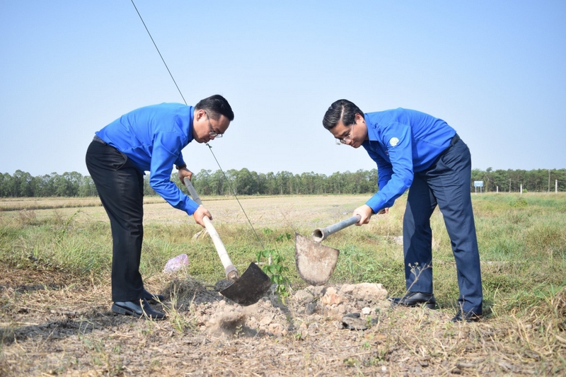 Đồng chí Nguyễn Thanh Tùng - Bí thư Tỉnh đoàn Tây Ninh và Nguyễn Minh Kiên – Bí thư Tỉnh đoàn, Chủ tịch Hội LHTN Việt Nam tỉnh Đồng Nai tham gia hoạt động trồng cây xanh tại Chốt Dân quân Gò Ngãi, xã Lợi Thuận, huyện Bến Cầu.
