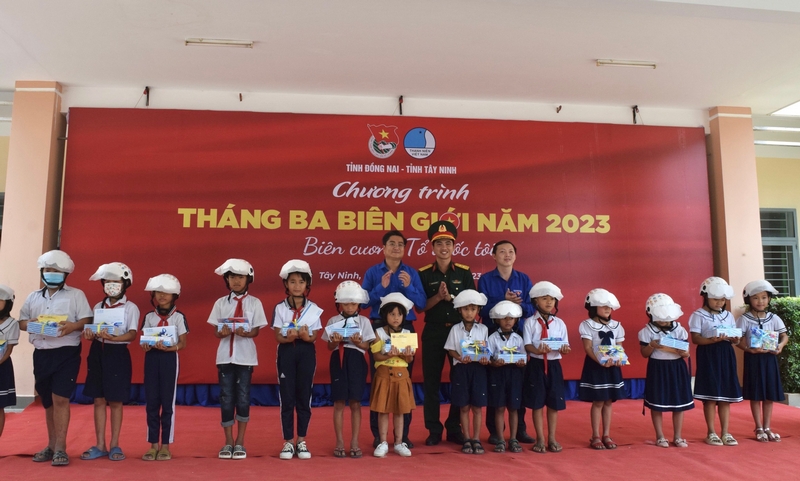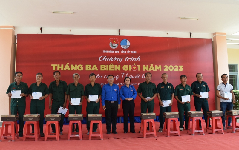 Trong buổi sáng cùng ngày, tại chương trình “Tháng Ba Biên giới” được tổ chức tại trường tiểu học Long Khánh A, đoàn đã tổ chức trao tặng 30 suất học bổng cho các em học sinh có hoàn cảnh khó khăn trên địa bàn huyện Bến Cầu; trao 10 phần quà cho các đồng chí là cựu Thanh niên xung phong; trao tặng 200 lá cờ Tổ quốc cho huyện Bến Cầu.