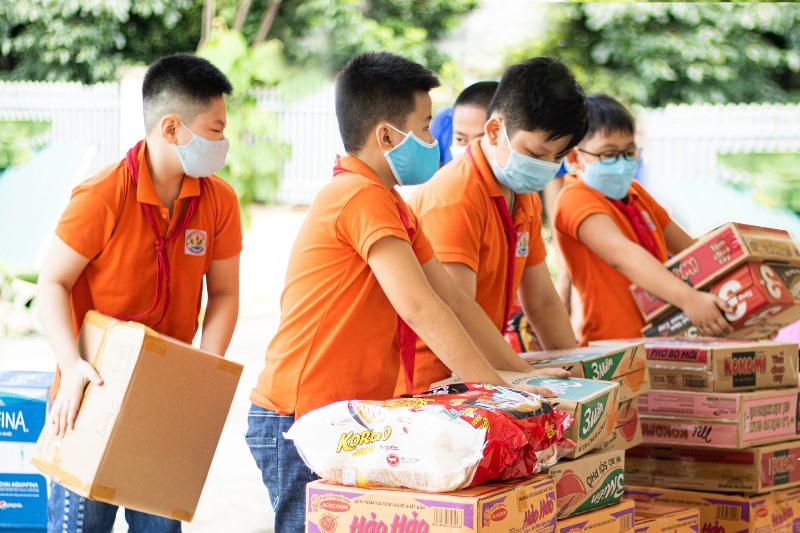 Các em học sinh hỗ trợ chuyển đồ