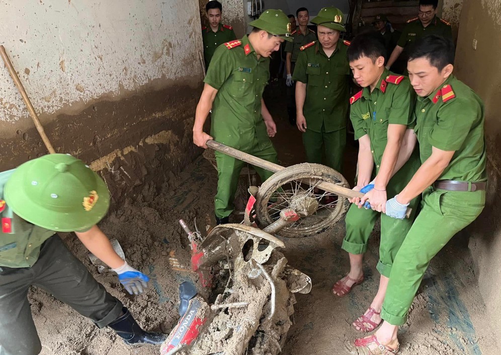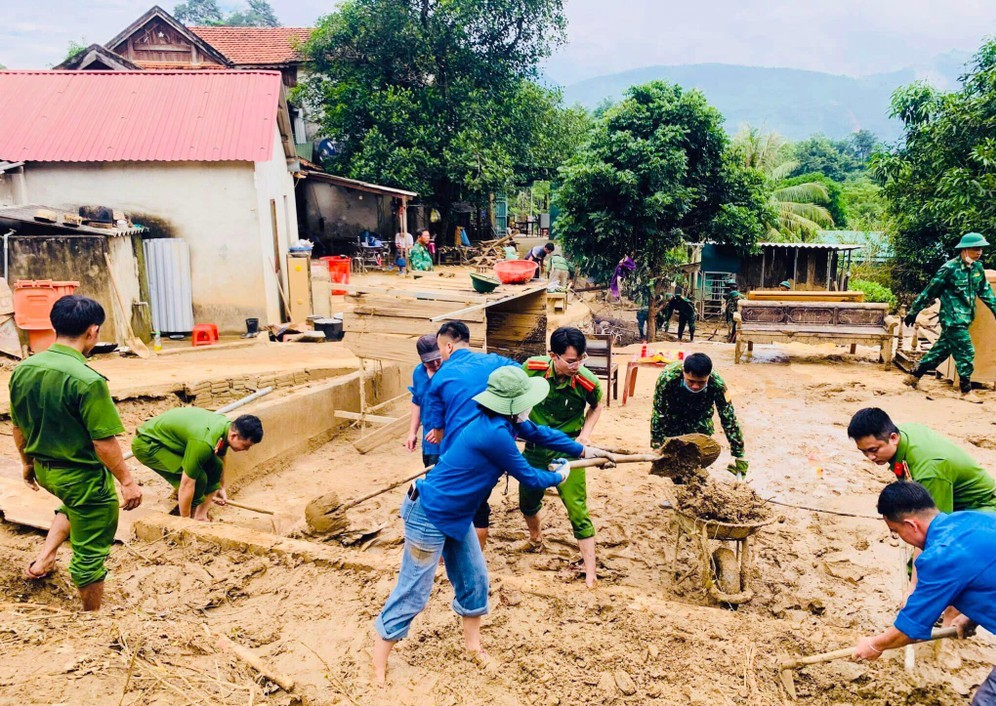 Lực lượng đoàn viên, thanh niên Công an tỉnh Nghệ An đã dốc toàn lực hỗ trợ người dân khắc phục hậu quả sau lũ. |