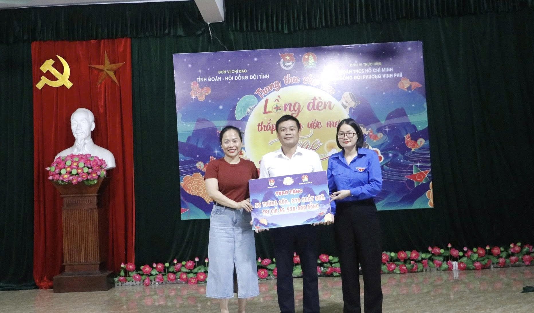 Tại “Đêm hội Trăng rằm”, Tỉnh đoàn - Hội đồng đội tỉnh Nghệ An cùng các đơn vị đồng hành đã trao tặng 200 thùng sữa và 1000 suất quà trị giá hơn 180 triệu đồng. Đây là nguồn động viên góp phần tiếp thêm niềm tin và nghị lực cho các em thiếu nhi vùng cao vượt khó vươn lên trong học tập và cuộc sống.