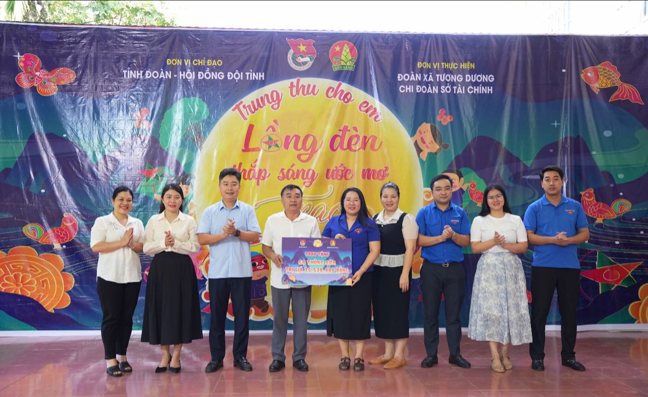 Cũng trong chiều nay, Tỉnh đoàn - Hội đồng Đội tỉnh Nghệ An phối hợp với Đoàn xã Tương Dương và Chi đoàn Sở Tài chính tổ chức chương trình Trung thu cho em - Lồng đèn thắp sáng ước mơ với chủ đề “Gói trăng trao em”. Dịp này, Tỉnh đoàn - Hội đồng đội tỉnh Nghệ An trao tặng 50 thùng sữa và 250 suất quà trị giá hơn 45 triệu đồng.