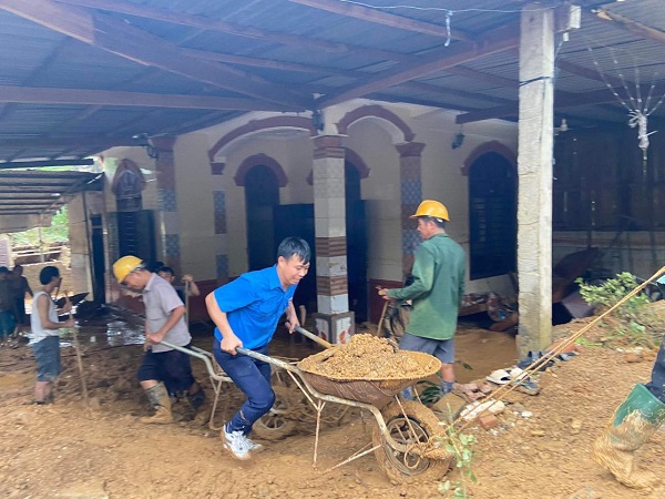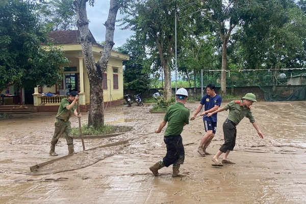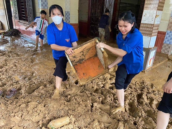 Ngay sau khi nước rút, hơn 350 đoàn viên, thanh niên của địa phương đã cùng nhau phối hợp với lực lượng chức năng để hỗ trợ người dân một cách tối đa nhất. Ảnh: Lương Nga
