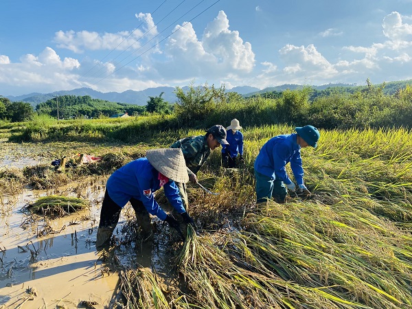Lực lượng đoàn viên, thanh niên hỗ trợ thu hoạch lúa bị đổ ngã sau lũ. Ảnh: Lương Nga