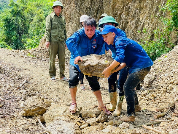 Trước tình hình đó, tuổi trẻ Thị trấn Thạch Giám cùng lực lượng dân quân tự vệ đã lội suối, băng rừng vào sửa chữa lại những điểm sạt lở, đảm bảo giao thông cho bà con nhân dân. Ảnh: Lô Lan