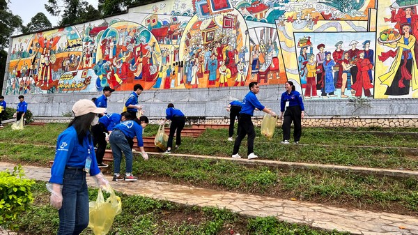 Thanh niên tình nguyên tham gia vệ sinh môi trường tại Khu Di tích Đền Hùng