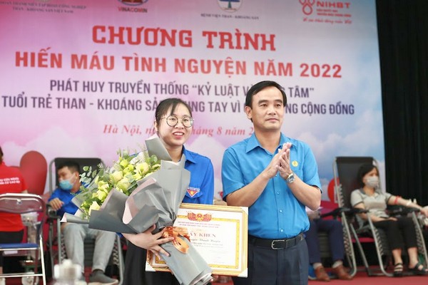 Ban tổ chức tặng Bằng khen hoa cho bạn Nguyễn Thanh Huyền (sinh năm 1995) đoàn viên thuộc Đoàn thanh niên Bệnh viện Than - Khoáng sản đến nay có 52 lần hiến máu và tiểu cầu, một thành tích rất đáng được trân trọng