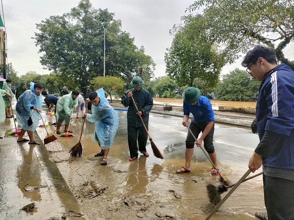 Đoàn viên, thanh niên đã có mặt tại tuyến đường Huỳnh Thúc Kháng từ sớm để hỗ trợ dọn dẹp bùn đất sau mưa lũ