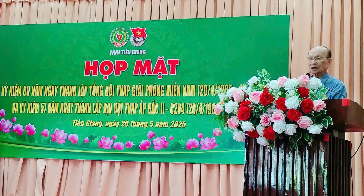 Đồng chí Trần Văn Mãnh, nguyên Tổng đội trưởng Tổng đội TNXP Giải phóng miền Nam chia sẻ, tri ân và tưởng nhớ các đồng chí, đồng đội đã anh dũng hy sinh vì sự nghiệp giải phóng dân tộc.