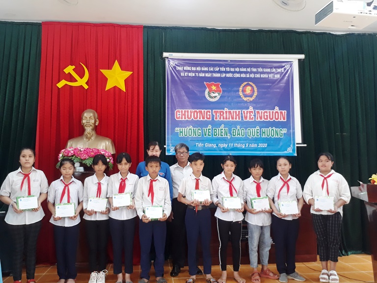 Đ/c Nguyễn Thị Mỹ Nương, Phó Bí thư Tỉnh Đoàn, Chủ tịch Hội Liên hiệp thanh niên Việt Nam tỉnh Tiền Giang trao học bổng cho học sinh có hoàn cảnh khó khăn