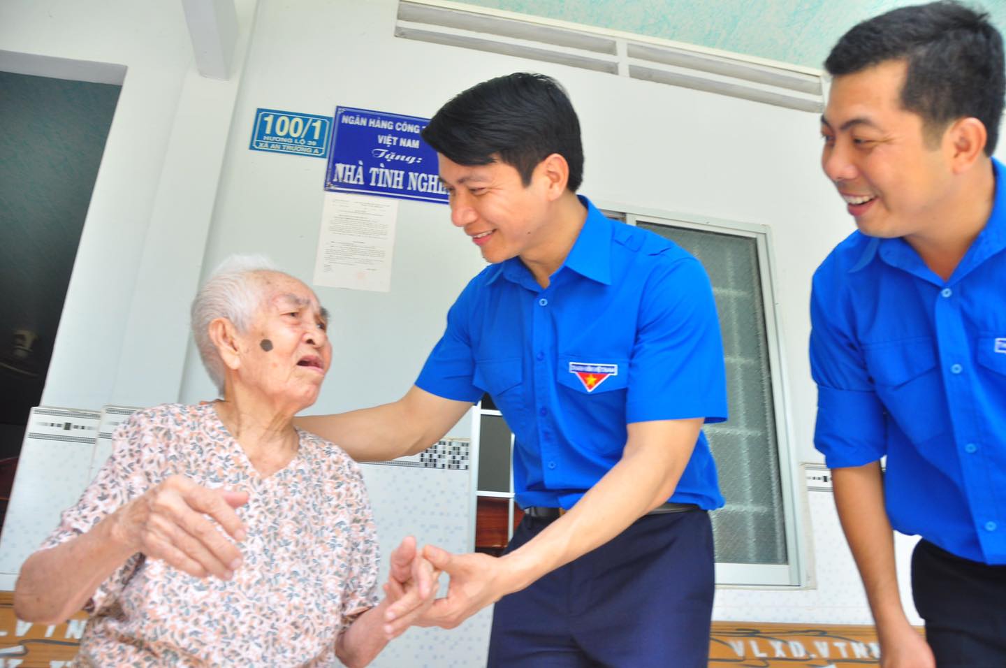 Bí thư Trung ương Đoàn Nguyễn Ngọc Lương thăm hỏi Mẹ Việt Nam anh hùng Lê Thị Tuội ở thị trấn Càng Long.