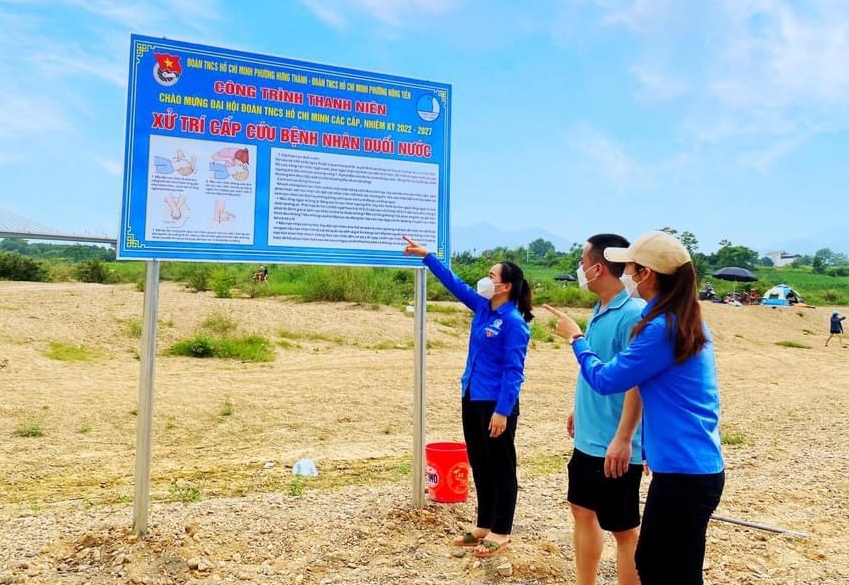 Tuổi trẻ Thành phố Tuyên Quang xây dựng 15 biển cảnh báo bằng lốp xe máy và hướng dẫn xử trí cấp cứu bệnh nhân đuối nước tại bãi soi Tình Húc