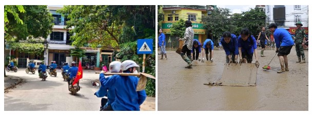Ngay khi đến nơi, các đoàn viên, thanh niên đã bắt tay chia làm các nhóm, nhóm nhận nhiệm vụ hỗ trợ, bốc dỡ, phân loại hàng hóa cứu trợ để chuyển đến cho bà con trong vùng mưa lũ. Nhóm xuất quân dọn dẹp vệ sinh môi trường trên các tuyến đường.