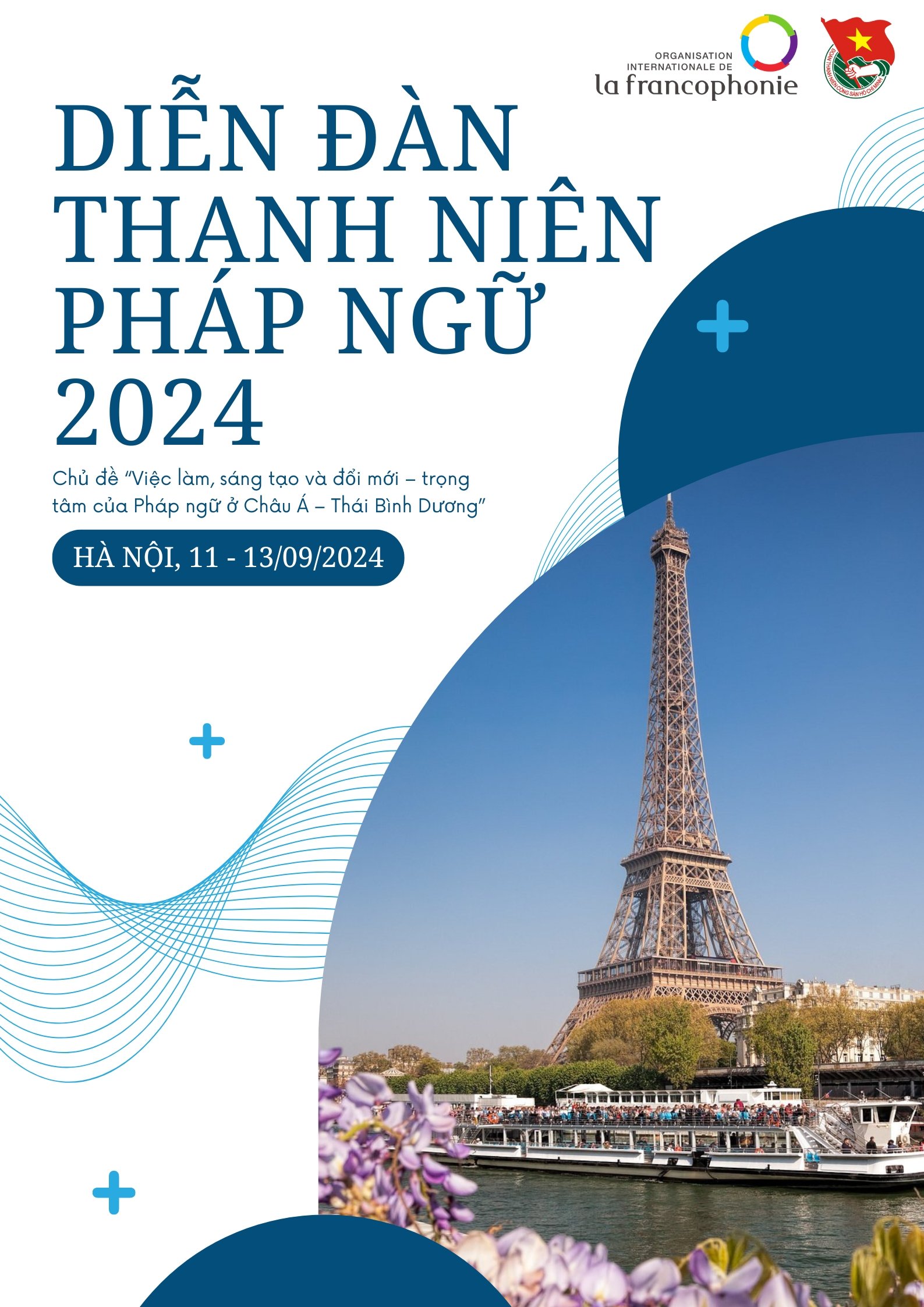 ĐTN: Trung ương Đoàn TNCS Hồ Chí Minh, Ủy ban quốc gia về thanh niên Việt Nam phối hợp với Văn phòng khu vực châu Á – Thái bình Dương của Tổ chức quốc tế Pháp ngữ (OIF) tổ chức Diễn đàn Thanh niên Pháp ngữ Châu Á – Thái Bình Dương năm 2024 với chủ đề “Việc làm, sáng tạo và đổi mới – trọng tâm của Pháp ngữ ở Châu Á – Thái Bình Dương”, cụ thể: