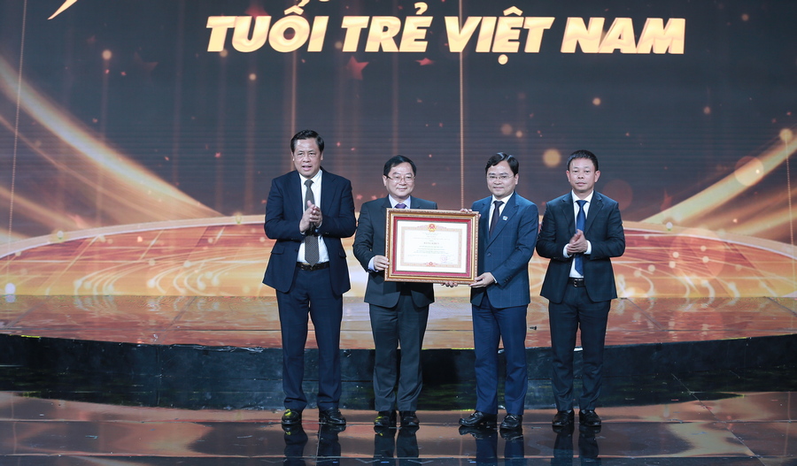 Thường trực Ban Bí thư Võ Văn Thưởng và Bí thư thứ nhất Trung ương Đoàn Nguyễn Anh Tuấn trao Bằng khen của Thủ tướng Chính phủ và cúp cho các gương mặt trẻ Việt Nam tiêu biểu 2020