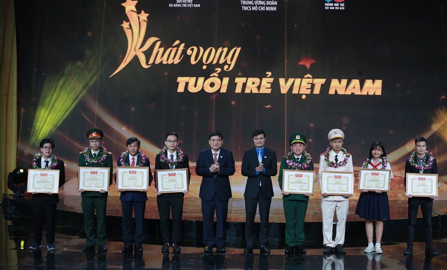 Ủy viên Bộ Chính trị, Thường trực Ban Bí thư Võ Văn Thưởng và Ủy viên T.Ư Đảng, Bí thư Thứ nhất T.Ư Đoàn, Chủ tịch T.Ư Hội Liên hiệp Thanh niên Việt Nam Nguyễn Anh Tuấn trao khen thưởng cho 10 Gương mặt trẻ Việt Nam tiêu biêu năm 2020