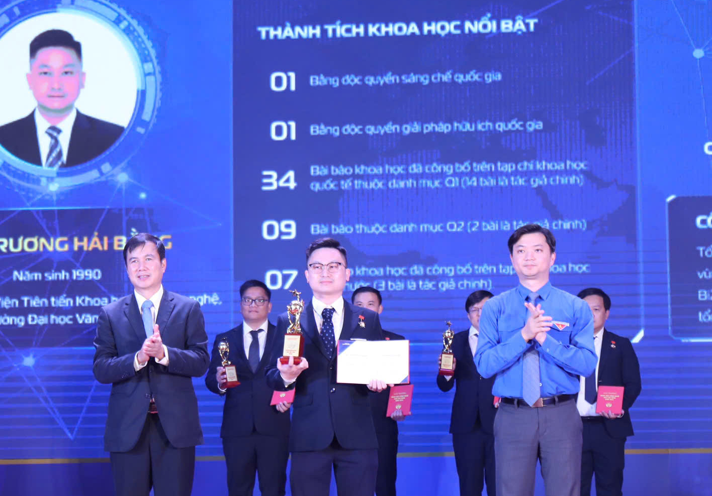 Đồng chí Bùi Thế Duy, Ủy viên dự khuyết Trung ương Đảng, Thứ trưởng Bộ Khoa học và Công nghệ và đồng chí Nguyễn Minh Triết, Bí thư Trung ương Đoàn, Chủ tịch Trung ương Hội Sinh viên Việt Nam trao tặng giải thưởng 'Quả Cầu Vàng' năm 2024