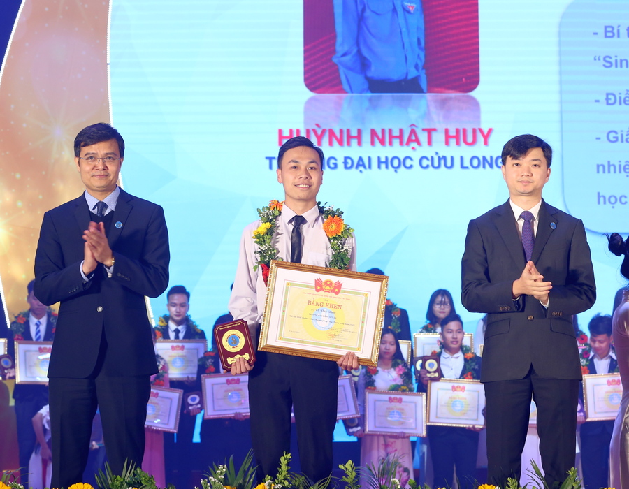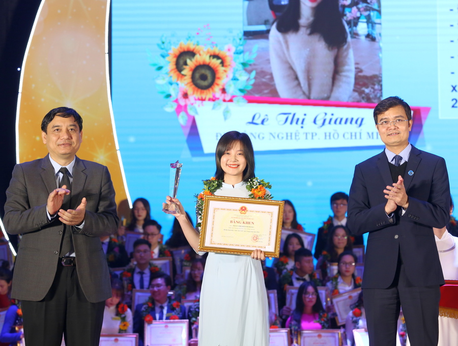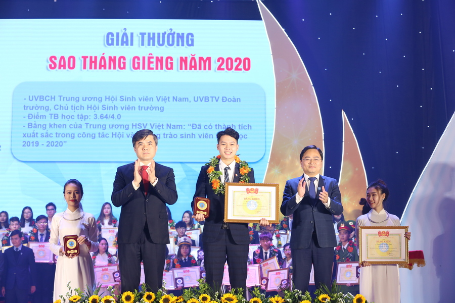 Đồng chí Bùi Quang Huy, Bí thư Thường trực TƯ Đoàn, Chủ tịch Hội sinh viên Việt Nam và đồng chí Nguyễn Minh Triết, Phó Chủ tịch Thường trực Hội sinh viên Việt Nam tặng Bằng khen và Biểu trưng cho sinh viên nhận Giải thưởng Sao Tháng Giêng năm 2020.