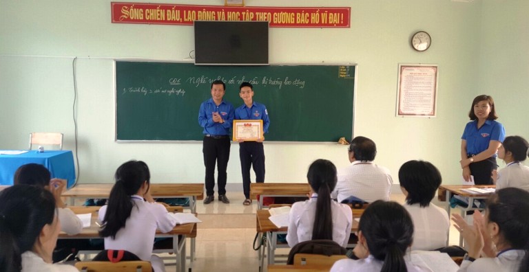 Trao bằng khen cho đoàn viên Nguyễn Hoàng Phúc - Chi đoàn lớp 11A, Đoàn trường THPT Nguyễn Huệ, thị xã Quảng Trị