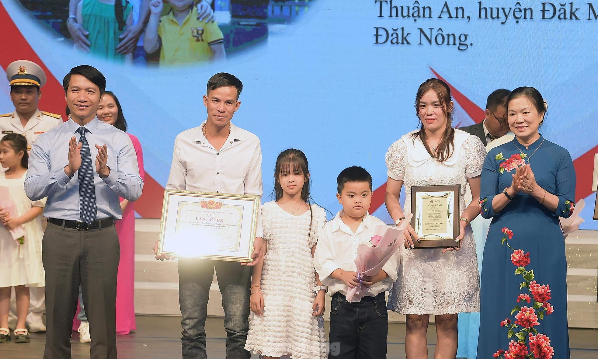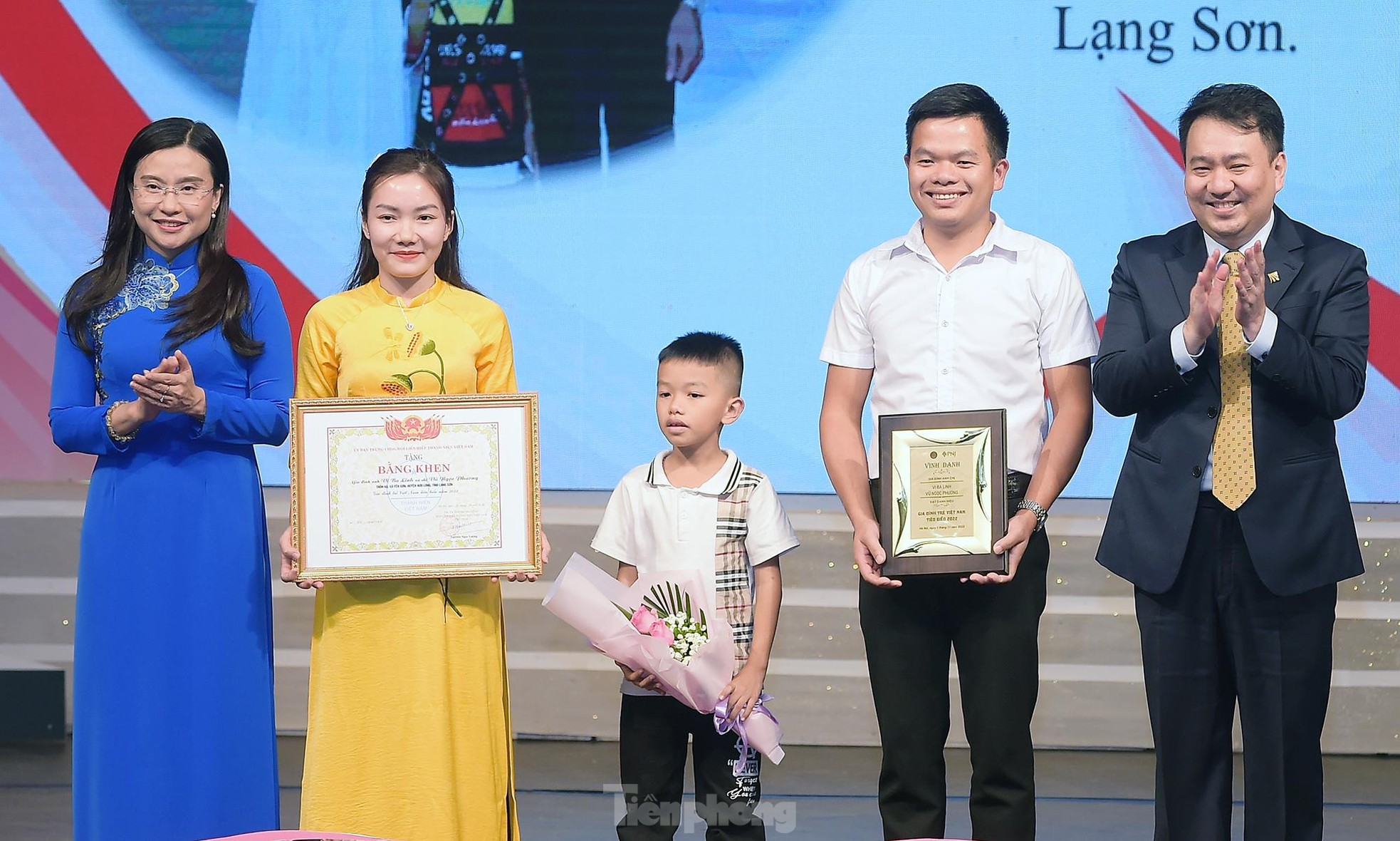 Đồng chí Phạm Tất Thắng - Ủy viên T.Ư Đảng, Phó trưởng Ban Dân vận T.Ư; đồng chí Bùi Quang Huy - Ủy viên dự khuyết T.Ư Đảng, Bí thư thứ nhất T.Ư Đoàn trao khen thưởng các gia đình trẻ Việt Nam tiêu biểu năm 2022. Ảnh: Xuân Tùng