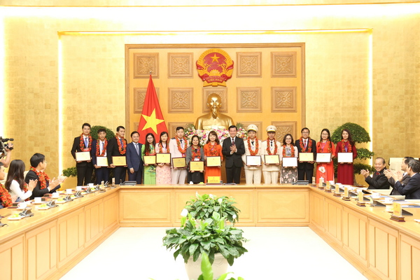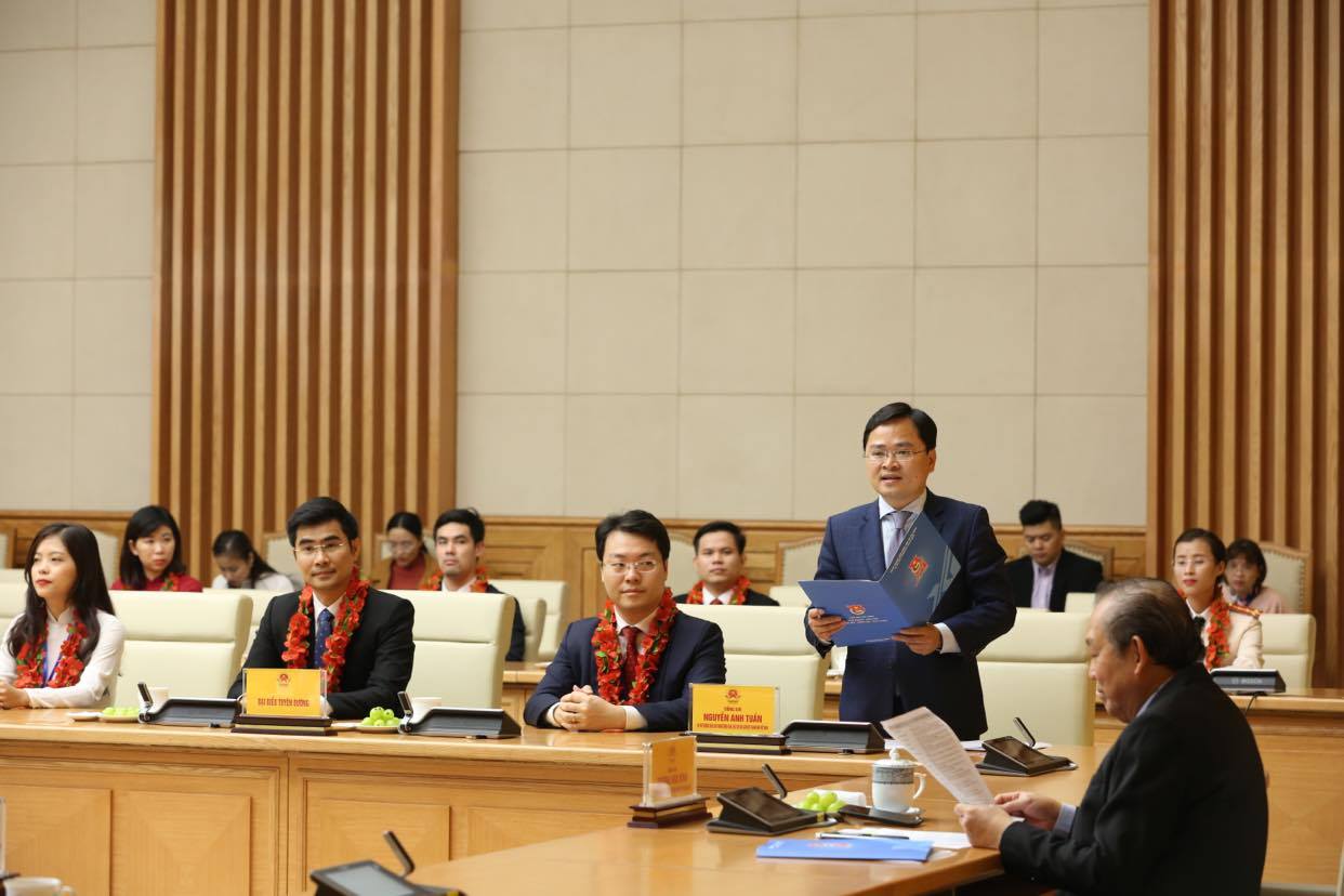 Bí thư thường trực Trung ương Đoàn Nguyễn Anh Tuấn báo cáo với Phó Thủ tướng Trương Hòa Bình tại lễ tuyên dương