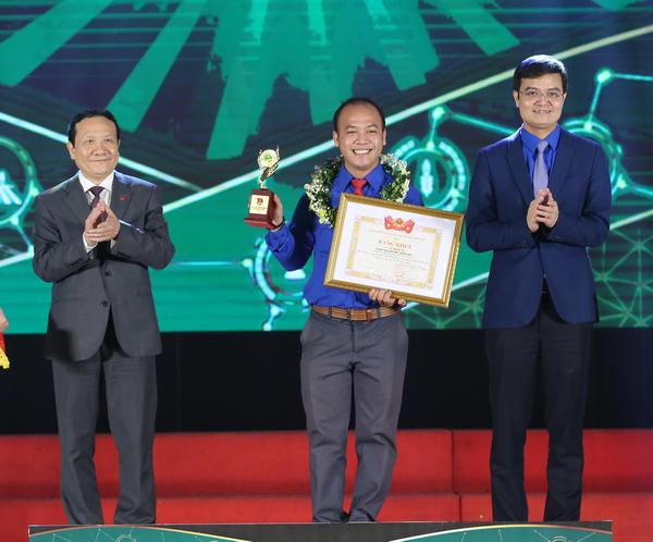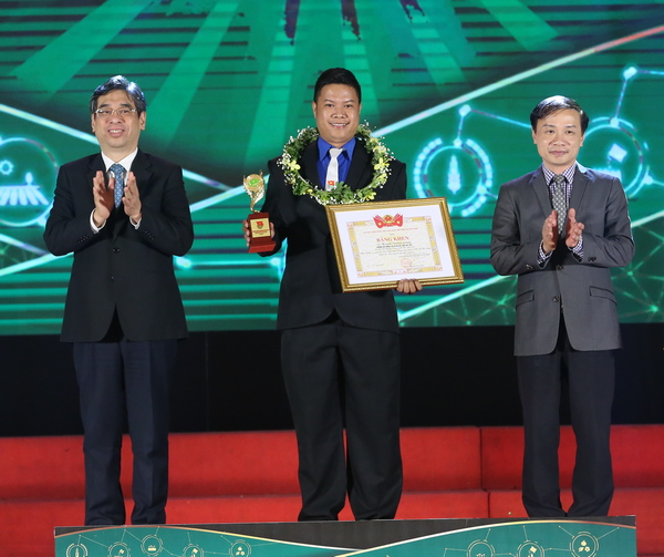 Đồng chí Bùi Quang Huy, Bí thư Thường trực TƯ Đoàn (bìa phải) trao giải thưởng cho nhà nông trẻ