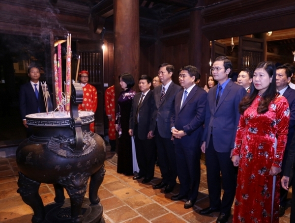 Các đồng chí lãnh đạo cùng đại diện thủ khoa xuất sắc làm lễ dâng hương tại nhà Thái Học của Văn Miếu - Quốc Tử Giám