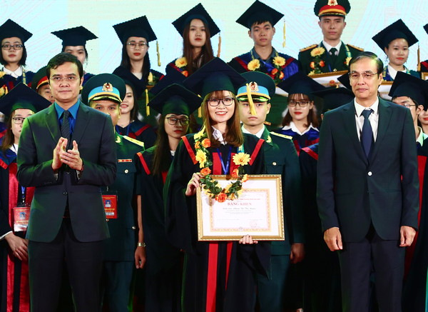 Đồng chí Bùi Quang Huy, Bí thư TƯ Đoàn, Chủ tịch Hội Sinh viên Việt Nam và đồng chí Đào Đức Toàn, Phó bí thư Thành ủy Hà Nội trao bằng khen và hoa tới các Thủ khoa xuất sắc