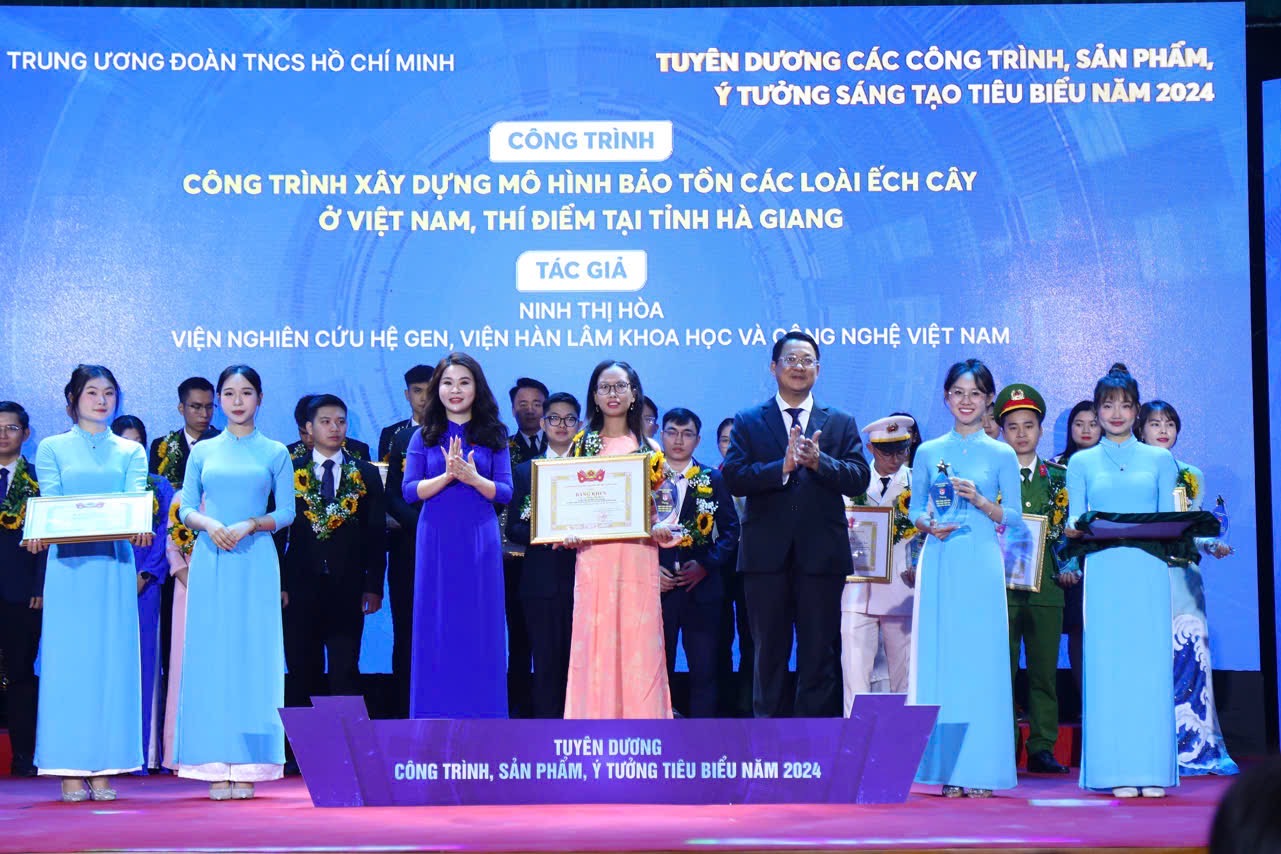 Bí thư Trung ương Đoàn Ngô Văn Cương (bìa trái) trao giải thưởng cho các công trình tiêu biểu.