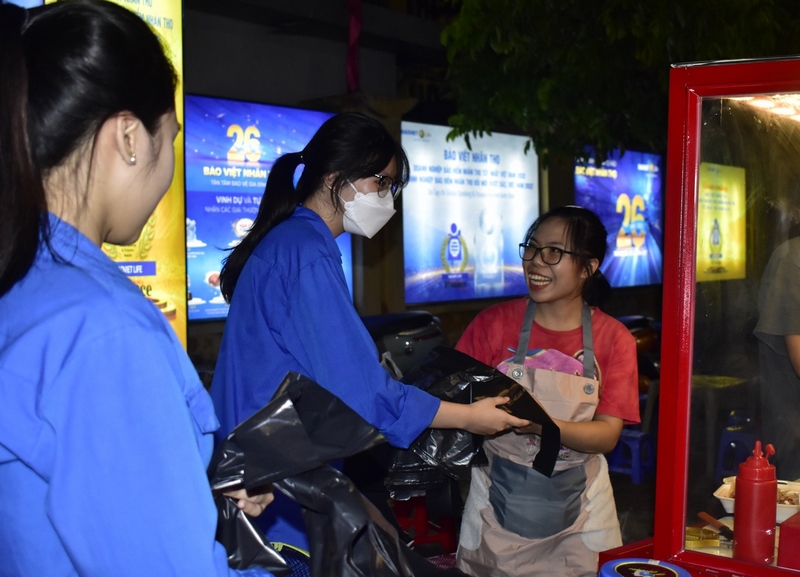 Các đội hình tình nguyện tham gia tặng túi sinh học cho các nhà hàng, quán ăn trên địa bàn Trung tâm Thành phố và dọn dẹp vệ sinh sau Lễ hội