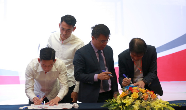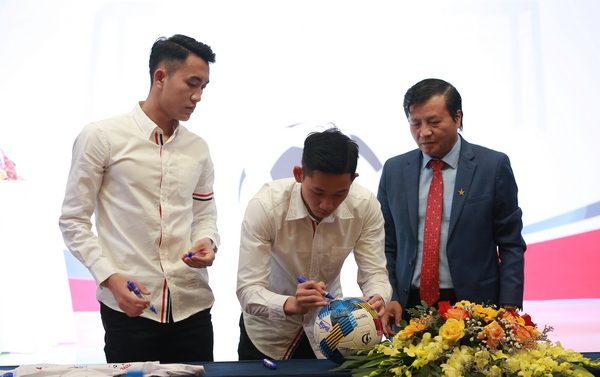 Ban tổ chức cùng nhà tài trợ, các cầu thủ Nguyễn Hai Long ký tặng áo đấu và bóng tại buổi lễ