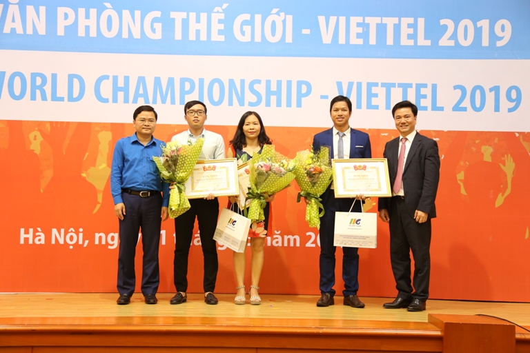 Đồng chí Nguyễn Anh Tuấn - Bí thư thường trực Trung ương Đoàn, Trưởng Ban chỉ đạo Cuộc thi MOSWC-Viettel 2019 trao giải cho 3 Quán quân Quốc gia năm nay