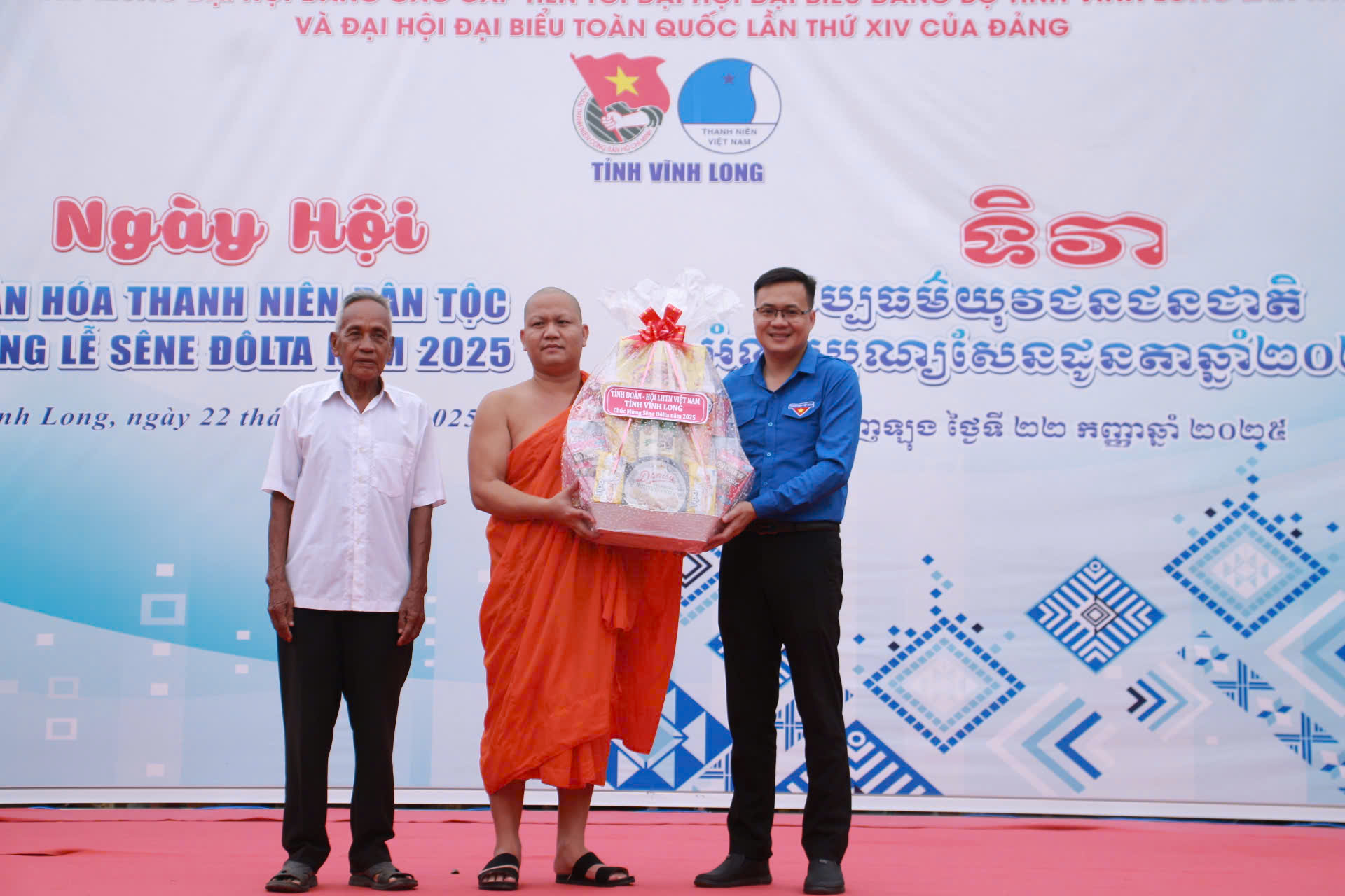 Ngoài ra, nhằm động viên, chia sẻ với các bạn thanh niên dân tộc Khmer có hoàn cảnh khó khăn được đón Lễ Sêne ĐôlTa vui vẻ, ấm cúng bên gia đình và người thân, Ban Thường vụ Tỉnh đoàn, Hội LHTN Việt Nam tỉnh đã vận động Tập đoàn Nha khoa Sài Gòn Tâm Đức khu vực Trà Vinh trao tặng 10 phần quà cho bà con nhân dân, thanh niên dân tộc Khmer có hoàn cảnh khó khăn, mỗi phần quà trị giá 500.000 đồng.