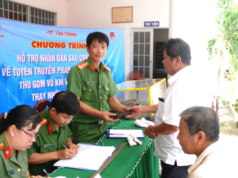 Đây là mô hình mới, từ trước đến nay tỉnh Vĩnh Long chưa thực hiện, khi người dân đến giao nộp VK, VLN, CCHT tại điểm tiếp nhận, thu gom VK, VLN, CCHT do Đoàn thanh niên Công an tỉnh và Phòng Cảnh sát QLHC về TTXH tổ chức lưu động tại Công an các huyện, thị xã, thành phố Vĩnh Long thì được tặng một phần quà gồm: 01 nón bảo hiểm xe, 01 hộp nhớt, 01 áo mưa, 01 móc khóa ANTT, gạo và được hỗ trợ tiền xăng (vũ khí quân dụng: 10kg gạo + 200.000đ; vũ khí thô sơ: 5kg gạo + 100.000đ) và được Công ty TNHH - TM Tân Thành thay nhớt xe miễn phí. Các loại VK - CCHT – VLN. Người dân cần phải giao nộp như: Súng quân dụng, súng điện, súng tự chế, súng bắn cồn, súng bắn đạn bi hoặc súng bắt đạn cao su, đạn hơi cay, pháo hiệu hoặc gậy điện, các loại đạn, võ đạn, hộp tiếp đạn, mã tấu, dao găm, kiếm, giáo, mác, thương, lưỡi lê, đao, côn, quả đấm, quả chùy, cung, nỏ, phi tiêu, còng khóa số 8, bình xịt hơi cay hoặc bình kích điện…v.v…