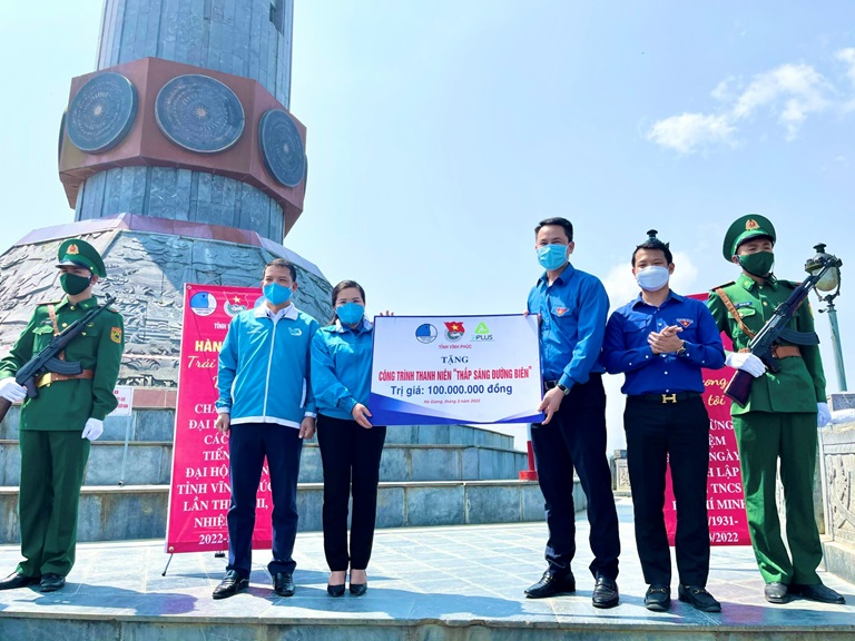 Đồng chí Nguyễn Kim Quy, Bí thư Tỉnh đoàn Vĩnh Phúc trao tặng công trình thanh niên "Thắp sáng đường biên" trị giá 100 triệu đồng cho Tỉnh Đoàn Hà Giang