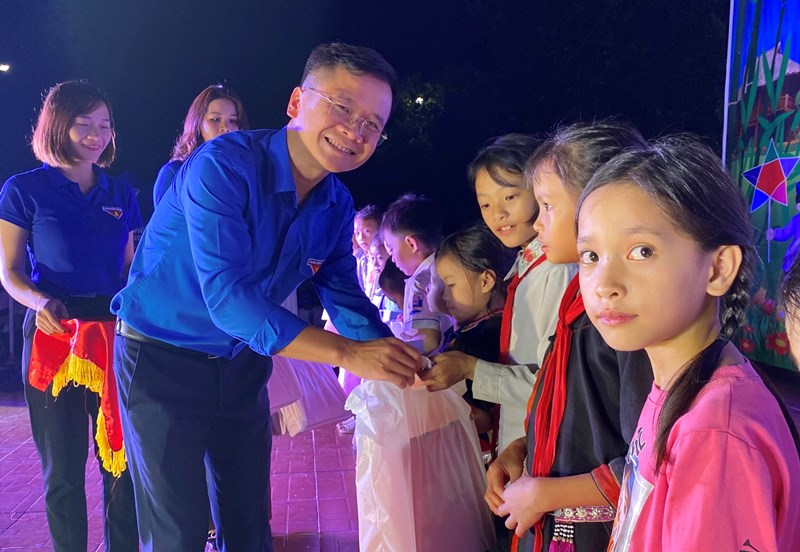 Đ/c Nông Bình Cương - Bí thư Tỉnh đoàn trao quà cho các em thiếu nhi có hoàn cảnh khó khăn vượt khó học tốt tại đêm hội