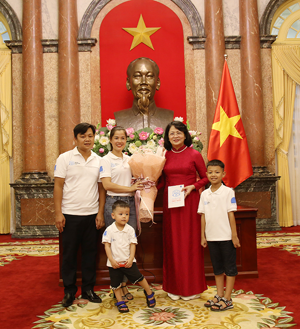 Gia đình trẻ tặng hoa Phó Chủ tịch nước Đặng Thị Ngọc Thịnh